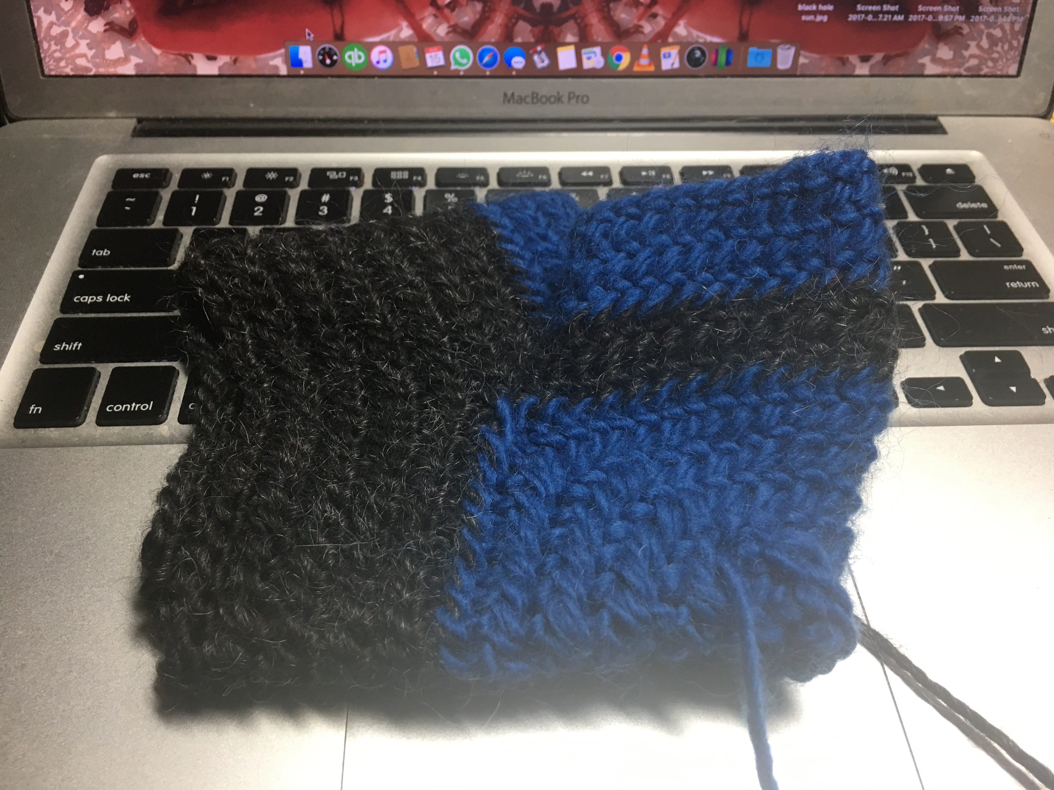 The issues that I found occurred while I made the sock were ones that seem to reappear regardless of plys of yarn, types of fiber, or anything else. I found that occasionally I would need to go back several stitches to redo one where I went through the center of the stitch instead of catching the whole strand under the needle on the stitch. Likewise, if I put the project down and come back to it, I need to make sure that the loops on my thumb are in the correct order, as if this is not done it creates a straight loop instead of one on a curve, laying in the same orientation as the rest. While this does not do anything to the structural integrity of the piece, it is nonetheless a small blemish that can be visually annoying. Mercifully, with the Oslo stitch, I’ve done it often enough that it’s easy for me to remember where I left off.