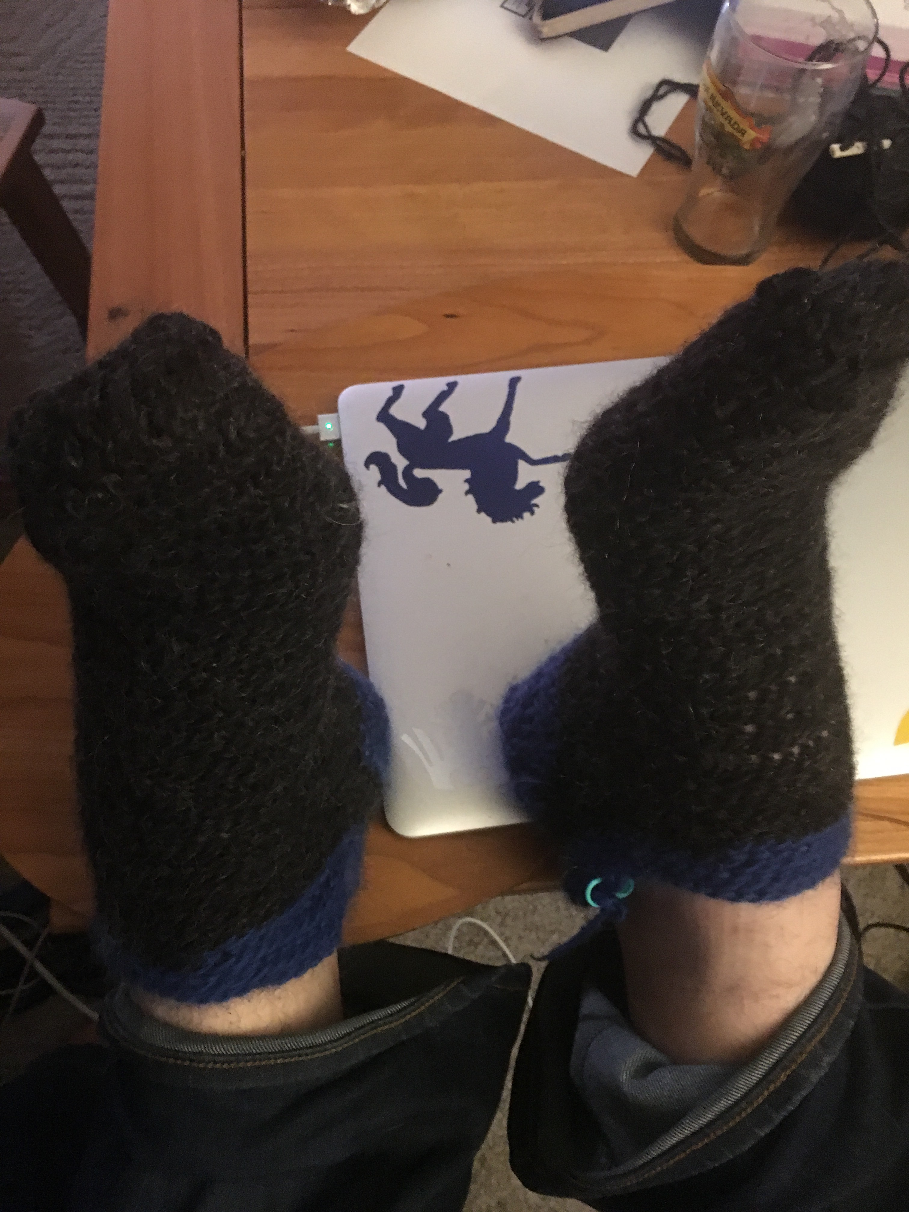 As the recipient wears a size 16 shoe, and I most assuredly do not have feet that size, there was a large amount of trial and error. (This is also because I suck at remembering to make notes and count stitches so I can exactly recreate later. It’s a terrible habit I may one day break.) There are certainly some disadvantages to this – such as the fact that occasionally I would find I couldn’t continue work until it had been tried on, or that I would have to undo some of the work to make it fit the way I wanted it to.