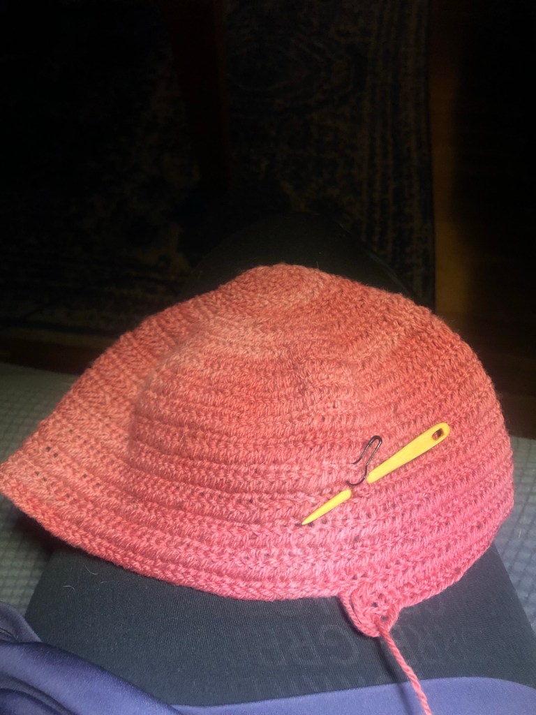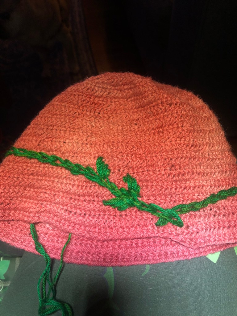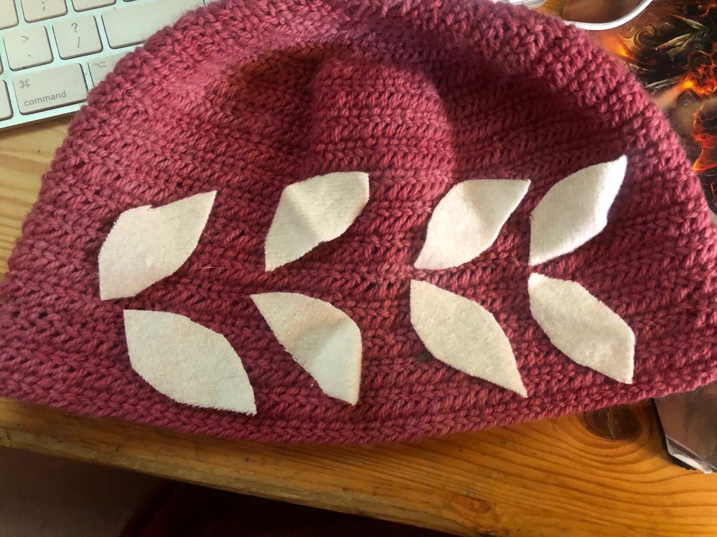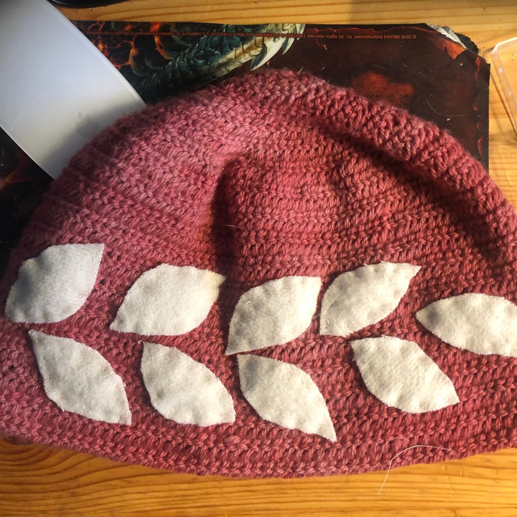 We come at this point to the facts of applique on nalbinding. It’s multiple steps, it may look a little weird, and you’re better off knowing you’re going to do it from the start. You’ll want to make sure that you are aware of the fact that you’re putting large pieces of essentially immobile elements on top of something that is very much mobile. The stretch that you expect to have as part of nalbinding will not be there. I was lucky, the final hat was almost the exact size of the recipient’s head, so I didn’t need to worry about it.